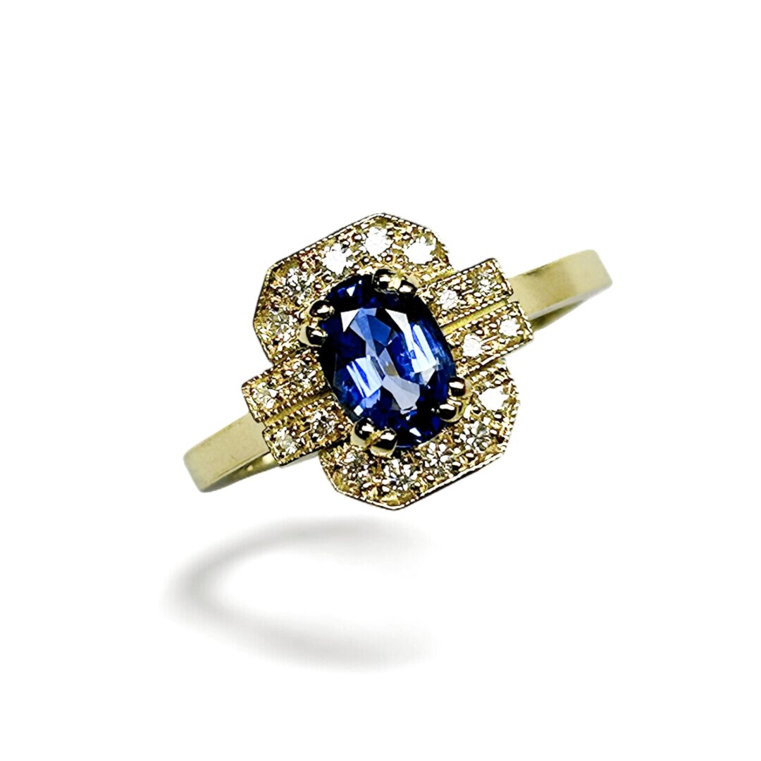 Une ligne et des motifs pour toujours intemporels, une version en couleur, cette bague est sertie en son centre d’un beau saphir de Ceylan ovale. Les motifs du plateau sont délicatement sertis de diamants.