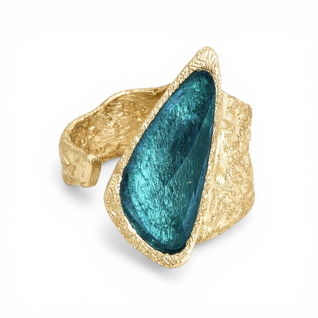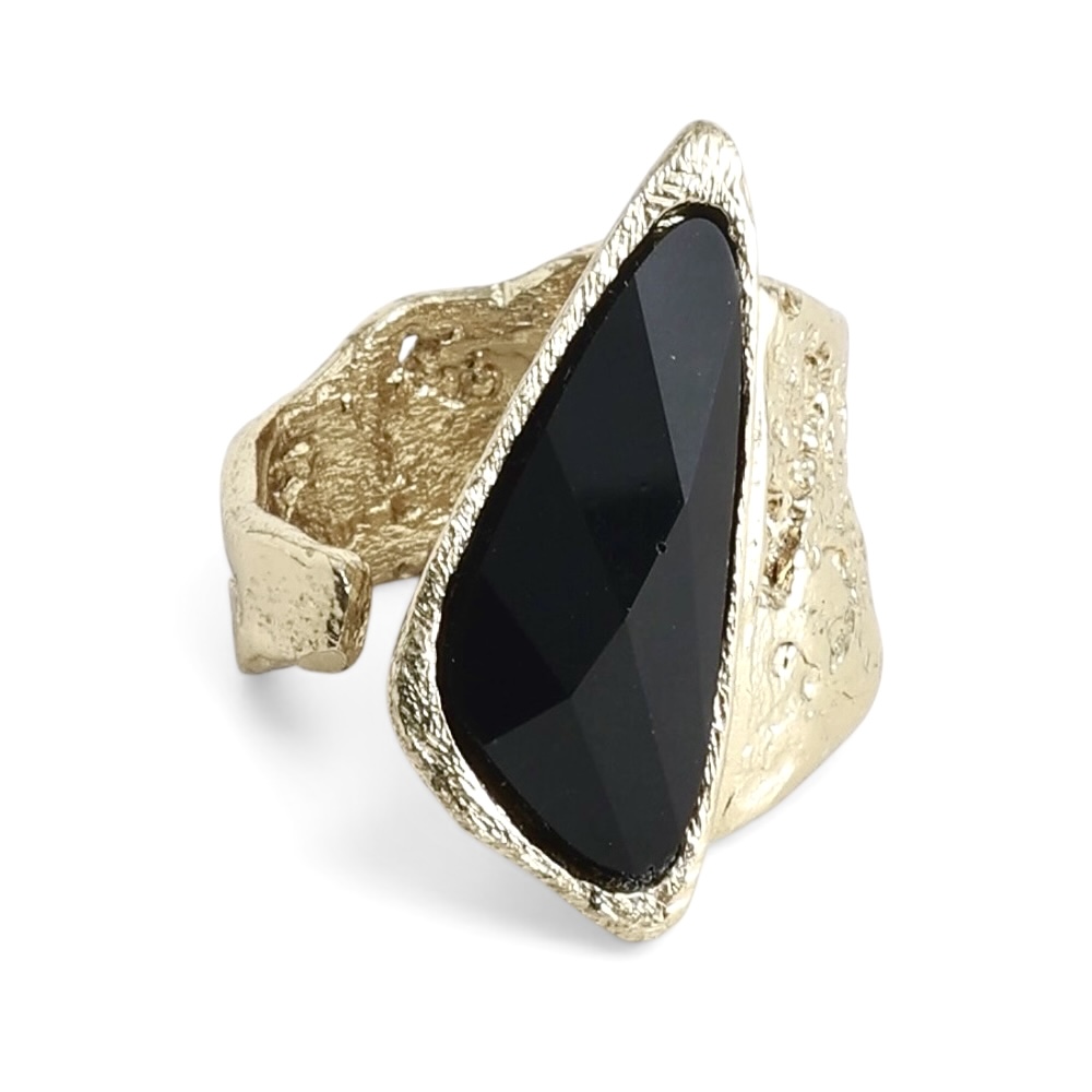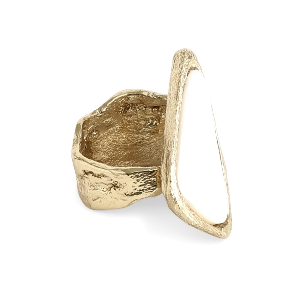Une bague en bronze d’un beau volume réhaussée d’une résine partiellement facettée de forme triangle irrégulier de couleur ivoire.