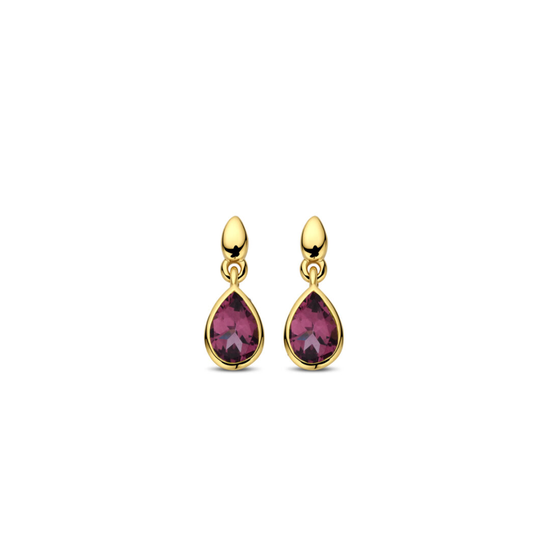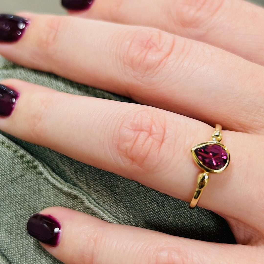 Une RHODOLITE en forme de goutte, taille poire facettée, sertie clos. Pas de diamants, uniquement cette jolie pierre de couleur.