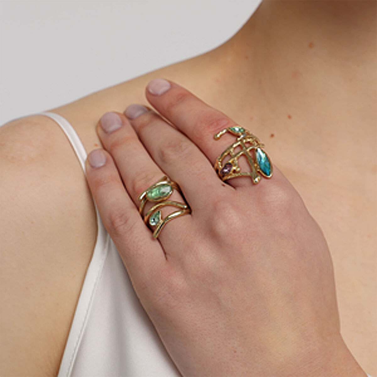 Une bague composée de multiples fils de bronze qui s’entrecroisent dans un chaos original. Un vrai et beau casse tête que l’on aime à porter ! 3 crystaux de couleur pastel viennent illuminer cette bague du plus bel effêt.