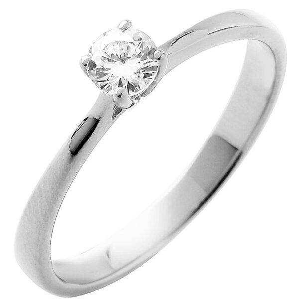 Un solitaire intemporel et délicat. Le corps de bague ruban, plein, non creusé, diminue graduellement jusqu’au chaton 4 griffes afin de faire ressortir le diamant.