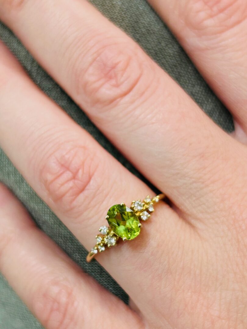 Une jolie bague délicate et romantique sertie d’un joli péridot et diamants.