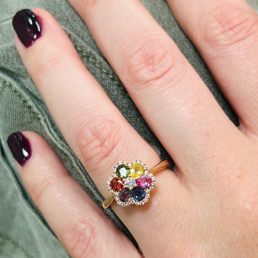 Pétales sertis de saphirs de couleurs taille poire, entourés de diamants.