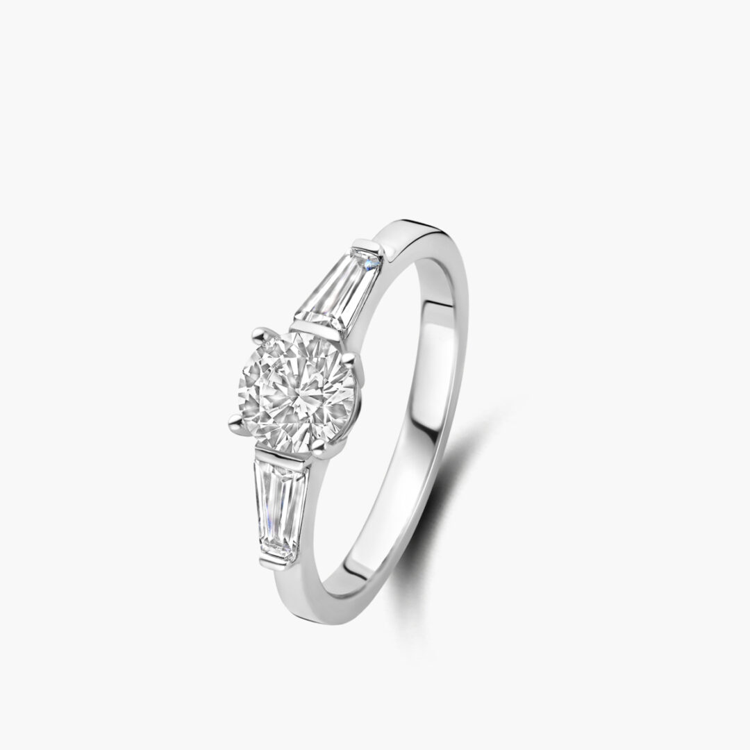 Bague solitaire épaulé diamant rond et trapèzes or blanc 18 carats Cherbourg