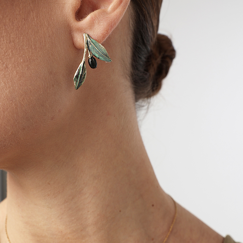 De jolies boucles d’oreilles en forme de rameau d’olivier en bronze oxydé vert et noir