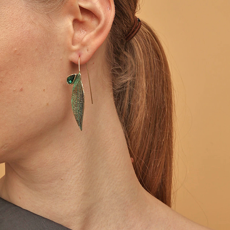 Un joli collier en forme de rameau d’olivier en bronze oxydé vert, réhaussé d’un crystal facetté de couleur verte.