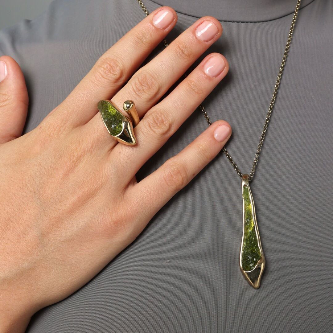 Collier avec un grand pendentif en bronze brossé réhaussé d’une pierre verte en résine verte couleur péridot.