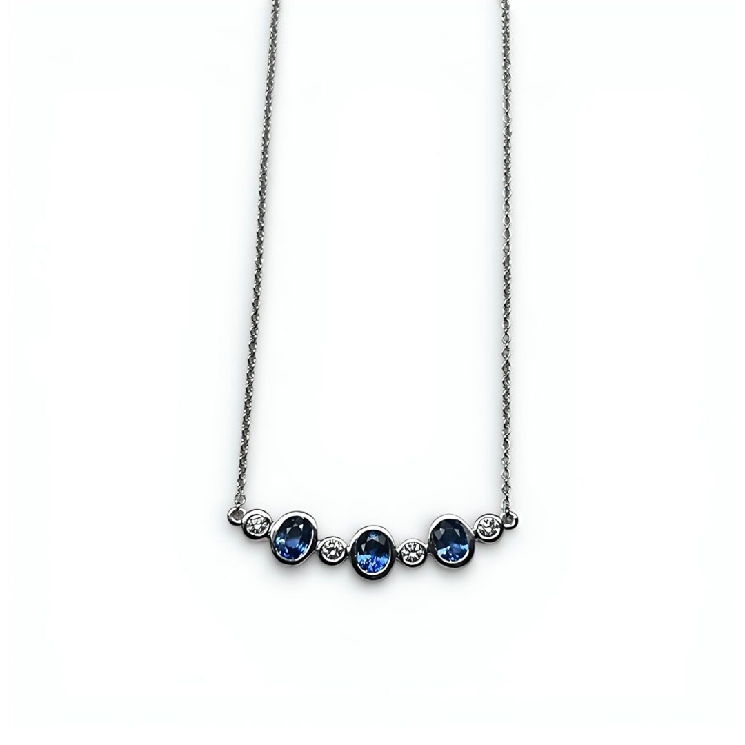 Un très joli collier trilogie de saphirs de Ceylan taille ovale, intercalés de diamants, le tout sertis clos sur or blanc 18 carats.