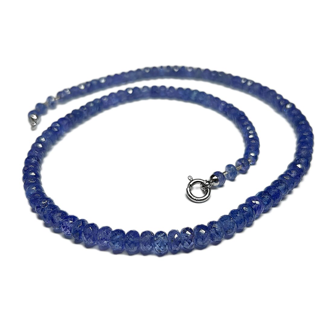 Un rang de Tanzanite naturelle AA+ non teintée, délicatement facettée pour illuminer ce beau bleu profond typique de cette pierre fine très recherchée.